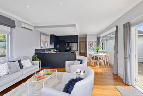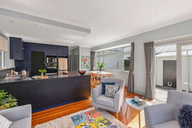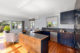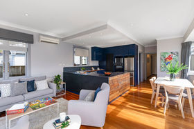 The rear of the home features a sundrenched and open plan kitchen/living, with indoor outdoor flow through the french doors on to the deck, creating a perfect location for entertaining over our final summer nights ahead.
